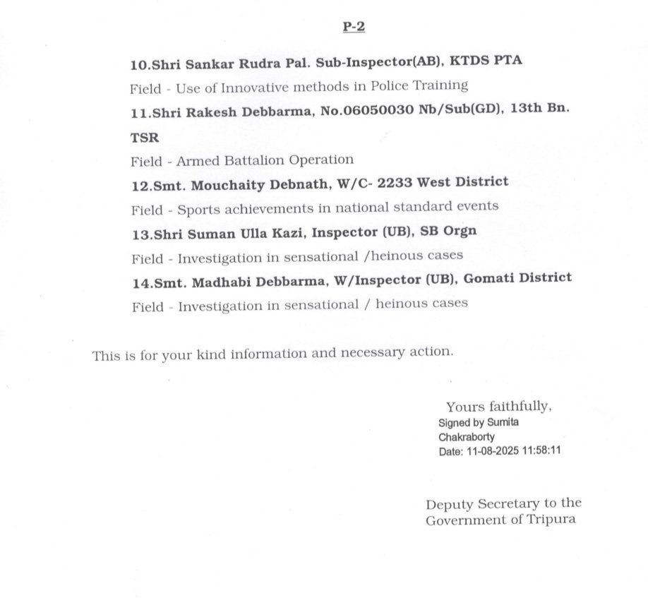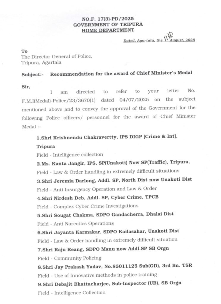 গোয়েন্দা কর্মকাণ্ডে নিজের দক্ষতার জন্য “মুখ্যমন্ত্রী পদক” পেলেন রাজ্য পুলিশের ডিআইজিপি ইন্টালিজেন্স আইপিএস কৃষ্ণেন্দু চক্রবর্তী। দীর্ঘ প্রায় ১৫ বছর বাদে এ বছর ফের স্বাধীনতা দিবসের প্রাক মুহুর্তে বিভিন্ন বিভাগে কর্মক্ষেত্রে দক্ষতা এবং সাফল্যের জন্য ত্রিপুরা পুলিশের ১৪ জন পুলিশ আধিকারিক এবং কর্মীকে মুখ্যমন্ত্রীর পদকের জন্য নির্বাচিত করা হয়েছে। সোমবার ১১ আগস্ট রাজ্য সরকারের স্বরাষ্ট্র দপ্তর থেকে পদক প্রাপ্ত ১৪ জন পুলিশ আধিকারিক এবং কর্মীর নাম প্রকাশিত হয়। সেই তালিকায় শীর্ষে রয়েছেন ডিআইজিপি ইন্টালিজেন্স আইপিএস কৃষ্ণেন্দু চক্রবর্তী। বিগত দিনে আইপিএস কৃষ্ণেন্দু চক্রবর্তীর নেতৃত্বে ত্রিপুরা পুলিশের গোয়েন্দা বিভাগ ব্যাপক সাফল্য অর্জন করেছে। এজন্যই তাকে এই পদকের তালিকায় শীর্ষে রাখা হয়েছে। এছাড়াও কর্ম ক্ষেত্রে দক্ষতার জন্য মুখ্যমন্ত্রীর পদক পাচ্ছেন বর্তমান ট্রাফিক পুলিশ সুপার আইপিএস কানতা জাঙ্গীর। আইপিএস কান্তা জাঙ্গীরকে উনকোটি জেলার পুলিশ সুপার থাকাকালীন আইনশৃঙ্খলা রক্ষায় পারদর্শিতা দেখানোর জন্য এই পদক দেওয়া হয়েছে। তালিকায় নাম রয়েছে বর্তমান ঊনকোটি জেলার অতিরিক্ত পুলিশ সুপার জেরিমিয়া ডারলং,অতিরিক্ত পুলিশ সুপার নির্দেশ দেব, গন্ডাছড়ার এসডিপিও সৌগত চাকমা, কৈলাশহরের এসডিপিও জয়ন্ত কর্মকার, অতিরিক্ত পুলিশ সুপার রাজু রিয়াং, টিএসআর তৃতীয় বাহিনীর সুবেদার জয়প্রকাশ যাদব, সাব-ইন্সপেক্টর দেবজিত ভট্টাচার্য, সাব ইন্সপেক্টর শংকর রুদ্র পাল, নায়েব সুবেদার রাকেশ দেববর্মা, মহিলা ইন্সপেক্টর মাধবী দেববর্মা, ইন্সপেক্টর সুমন উল্লা কাজী, মহিলা কনস্টেবল মৌচৈতি দেবনাথের । আগামী দিনে ১৫ আগস্ট আনুষ্ঠানিক ভাবে তাদের হাতে পদক তুলে দেওয়া হতে পারে।