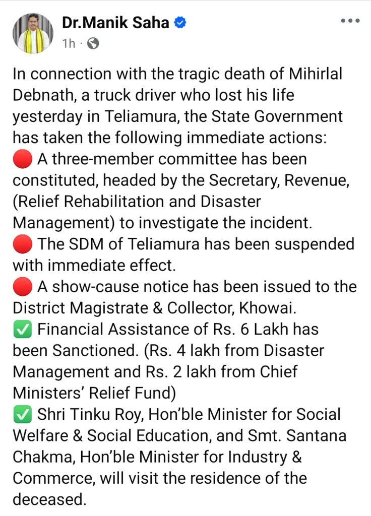 তেলিয়ামুড়া চাকমাঘাটে দুর্ঘটনার পর প্রশাসনিক দুর্বলতায় লরি চালকের মৃত্যুর ঘটনায় করা পদক্ষেপ নিলেন মুখ্যমন্ত্রী অধ্যাপক ডাক্তার মানিক সাহা। সঠিক সময়ে আহত লরি চালককে উদ্ধারে ব্যর্থতার কারণে বরখাস্ত করা হয়েছে তেলিয়ামুড়া মহকুমা শাসক পরিমল মজুমদারকে। কারণ দর্শানোর নোটিশ করা হয়েছে খোয়াই জেলা প্রশাসনকে । এছাড়া রাজস্ব দফতরের সচিবের নেতৃত্বে ৩ জনের তদন্ত কমিটি গঠন করা হয়েছে। একইভাবে দুর্যোগ মোকাবেলা খাতে ৪ লক্ষ টাকা এবং মুখ্যমন্ত্রীর ত্রাণ তহবিল থেকে ২ লক্ষ টাকা সহ মোট ৬ লক্ষ টাকা মৃতের পরিবারের জন্য ঘোষণা করা হয়েছে। মন্ত্রী সান্ত্বনা চাকমা এবং মন্ত্রী টিঙ্কু রায় সরকারের প্রতিনিধি হয়ে মৃতের বাড়িতে গিয়ে এই সাহায্য তুলে দেবেন এবং সমবেদনা জ্ঞাপন করবেন।