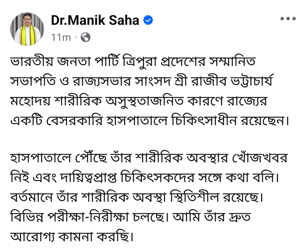 প্রচন্ড বুক ব্যথার কারণে আইএলএস হাসপাতালে ভর্তি আছেন প্রদেশ বিজেপি সভাপতি তথা রাজ্যসভার সাংসদ রাজিব ভট্টাচার্য। শুক্রবার দুপুরে তাকে আইএলএস হাসপাতালে নিলে ভর্তি রাখা হয়। খবর পেয়ে কিছুক্ষণের মধ্যেই হাসপাতালে ছুটে যান রাজ্যের মুখ্যমন্ত্রী অধ্যাপক ডক্টর মানিক সাহা। মুখ্যমন্ত্রী সাংসদের শারীরিক অবস্থার বিস্তারিত খবর নেন । পরবর্তীকালে সাংবাদিকদের এ বিষয়ে প্রতিক্রিয়া দিতে গিয়ে মুখ্যমন্ত্রী বলেন বুকের ব্যথার কারণে সংসদ রাজিব ভট্টাচার্যকে হাসপাতালে ভর্তি রাখা হয়েছে। ডাক্তার সমস্ত ধরনের প্রয়োজনীয় চিকিৎসা করছেন।