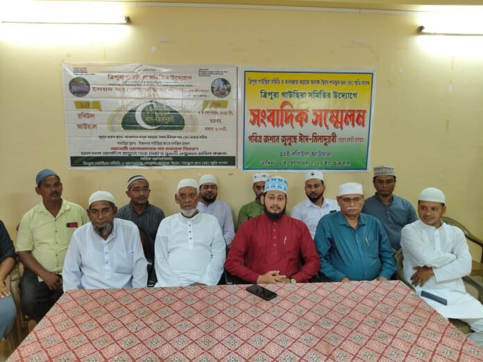 আগামী ৫ সেপ্টেম্বর ইসলামিক আরবি ১২ রবিউল আউয়াল বিশ্ব শান্তির দূত হিসেবে পরিচিত ইসলাম ধর্মের প্রবর্তক হযরত মুহাম্মদ সাল্লাল্লাহু আলাইহি ওয়াসাল্লাম এর জন্মদিন। দিনটিকে সামনে রেখে গোটা বিশ্বের ধর্মপ্রাণ মুসলিমরা আবেগে মেতে উঠেছেন। আমাদের রাজ্যেও নবীর জন্মদিনে বিভিন্ন ধরনের সামাজিক এবং মানবিক কর্মসূচির মধ্য দিয়ে দিনটি উদযাপনের প্রস্তুতি নিয়েছেন মুসলিমদের বিভিন্ন ধর্মীয় সামাজিক সংগঠন। প্রতি বছরের ন্যায় এবারো ১২ রবিউল আউয়াল নবীর জন্মদিন উপলক্ষে আগরতলা শহরে বর্ণাঢ্য ধর্মীয় শোভাযাত্রার আয়োজন করেছে ত্রিপুরার ইন্দ্রনগর স্থিত মুসলিম ধর্মীয় সামাজিক সংগঠন ত্রিপুরা গাউছিয়া সমিতি এবং আল্লামা সৈয়দ ইউসুফ শাহ মাজার শরীফ কমিটি। এই উপলক্ষে ৩ সেপ্টেম্বর বুধবার আগরতলা প্রেসক্লাবে একটি সাংবাদিক সম্মেলন করেন গাউছিয়া সমিতির প্রতিনিধিরা। সাংবাদিক সম্মেলনে উপস্থিত ছিলেন গাউছিয়া সমিতির সভাপতি আব্দুল বারিক চৌধুরী, সম্পাদক মোহাম্মদ জনাব আলী, ইন্দ্রনগর জামে মসজিদের ইমাম মোঃ নজরুল ইসলাম কাদেরী, অ্যাডভাইজারি কমিটির চেয়ারম্যান অ্যাডভোকেট লুৎফুর রহমান খাদীম, বিশিষ্ট সমাজসেবী মুফতি মুহাম্মদ সাহাবুদ্দিন, ভারতীয় বিমান বাহিনীর প্রাক্তন জোয়ান নিজাম উদ্দিন সহ অন্যরা।